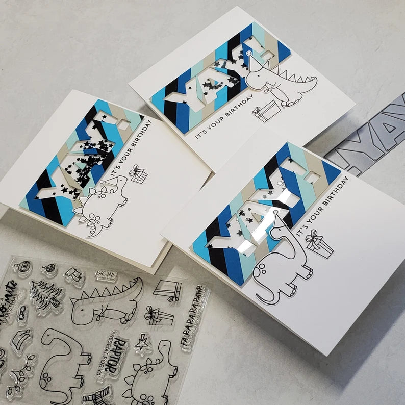Handmade Birthday card featuring a bold sentiment with a fun shaker element. YAY is cut into custom made striped pattern paper, with black star confetti behind to create shaker element. Dinosaurs and elements are popped up for added dimension and interest.