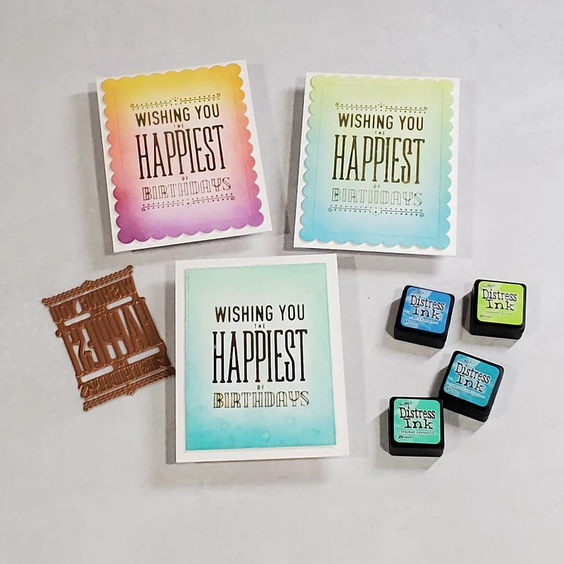 Handmade Birthday card featuring beautiful gold foiled typographic sentiment. Backgrounds are made by ink-blending a variety of bright, bold colors. Backgrounds are die cut for a fun detailed edge element (stitched or scalloped) and mounted with foam for added dimension.